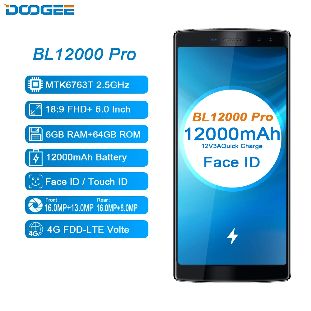 BEST QUALITY DOOGEE BL12000 Pro 12000mAh Smartphone MTK6763T 6.0''18:9 FHD+ 2.5GHz 6GB RAM 64GB ROM Quad Camera